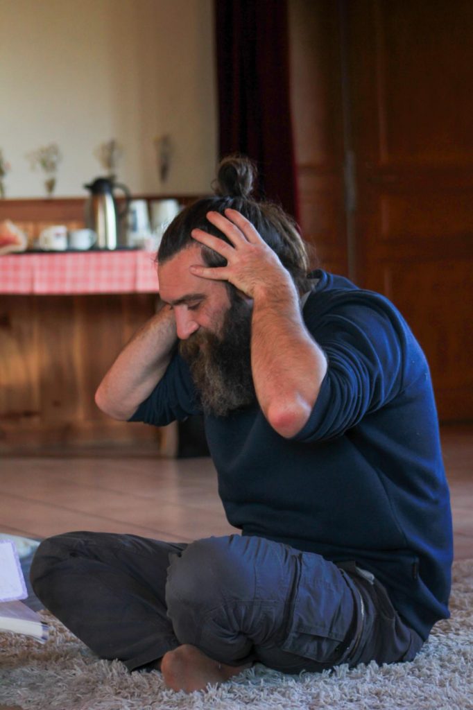 L’après-midi, les ateliers continuent d’explorer. Sarah anime un atelier d’art-thérapie argile où les mains se libèrent, Natacha poursuit ses pratiques astrologiques, et Karine introduit la théorie polyvagale (régulation du système nerveux) dans une séance accessible à tous et toutes. À l’extérieur, Bernadette rouvre sa bergerie pour une dernière séance de mouton-thérapie, tandis que les praticien·ne·s (Mickael en shiatsu, Ô-rélie en massage, Bernard, Léa en voyages sonores…) continuent d’accompagner individuellement et en petits groupes celles et ceux qui en ont besoin.