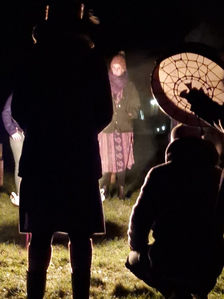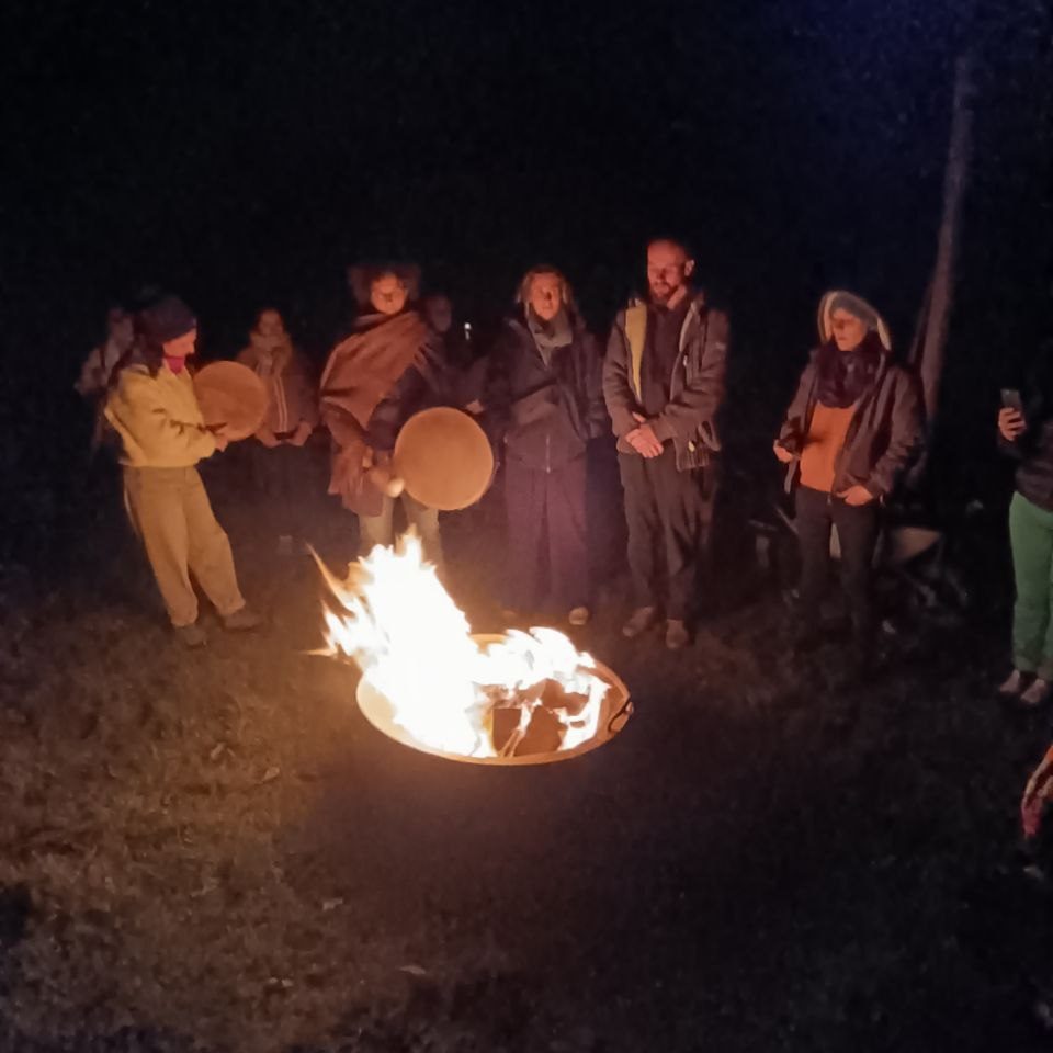 Sous le ciel de janvier, les participant·e·s se rassemblent autour des flammes. Tambours, chants… Certain·e·s déposent des intentions dans le feu, d’autres simplement écoutent les crépitements et le souffle du vent.
