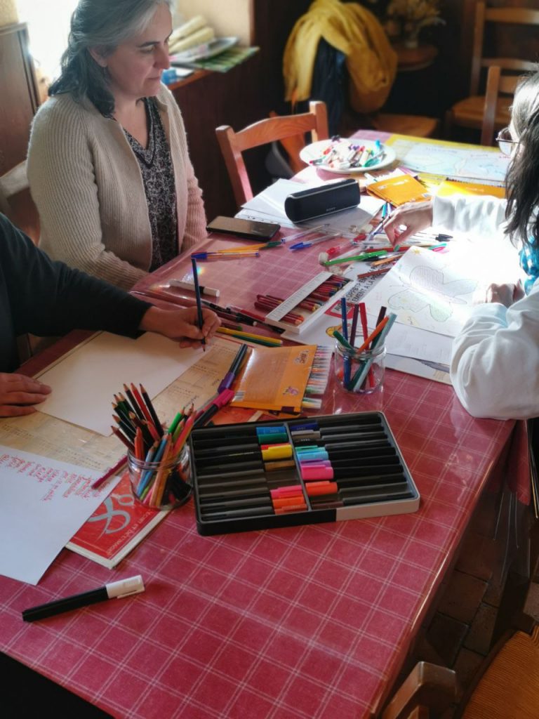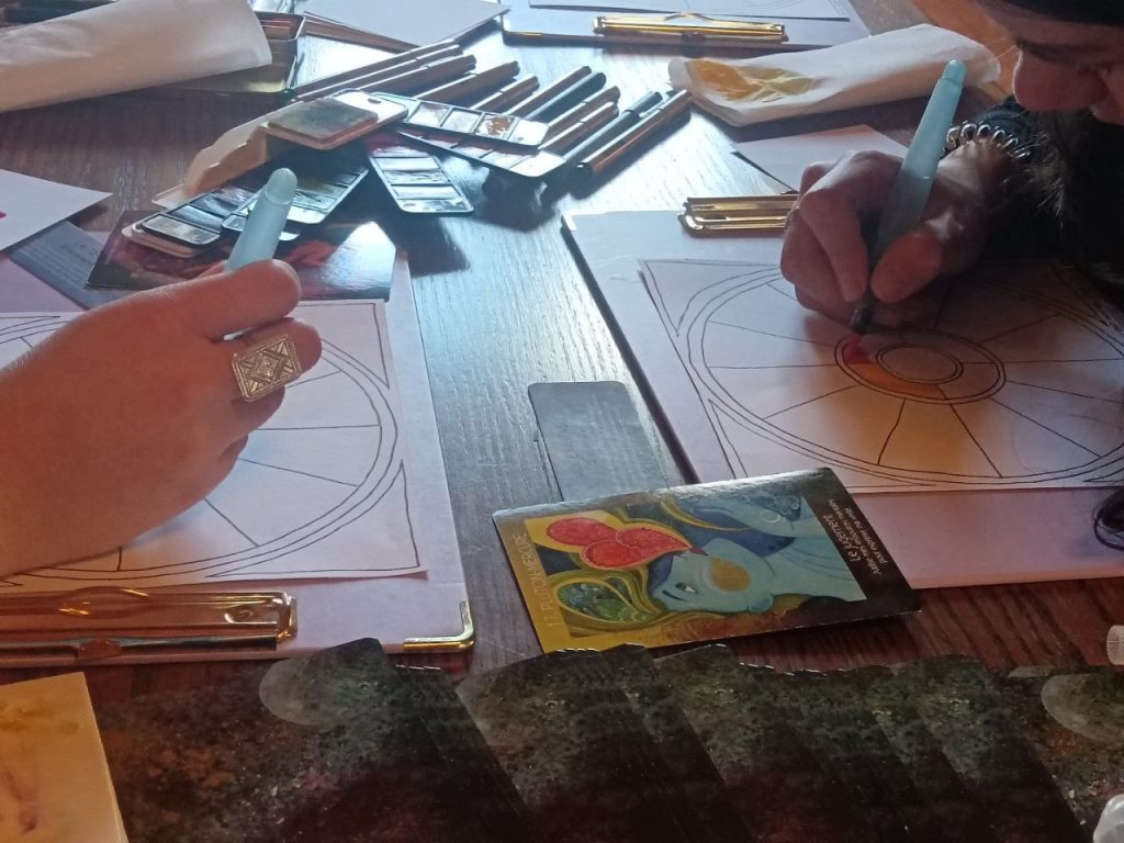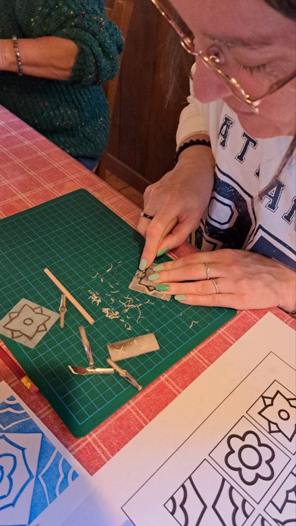 Le dimanche commence en douceur. Après le café d’accueil, le Grand Cercle d’ouverture du dimanche réunit à nouveau le groupe, puis les ateliers reprennent, dans la continuité de la veille. Au programme : massage crânien avec Maca, yoga du rire avec Marina, un atelier sur l’enfant intérieur avec Julie, de la linogravure avec Marie Reine, et toujours des voyages sonores avec Léa en petits groupes de 6.