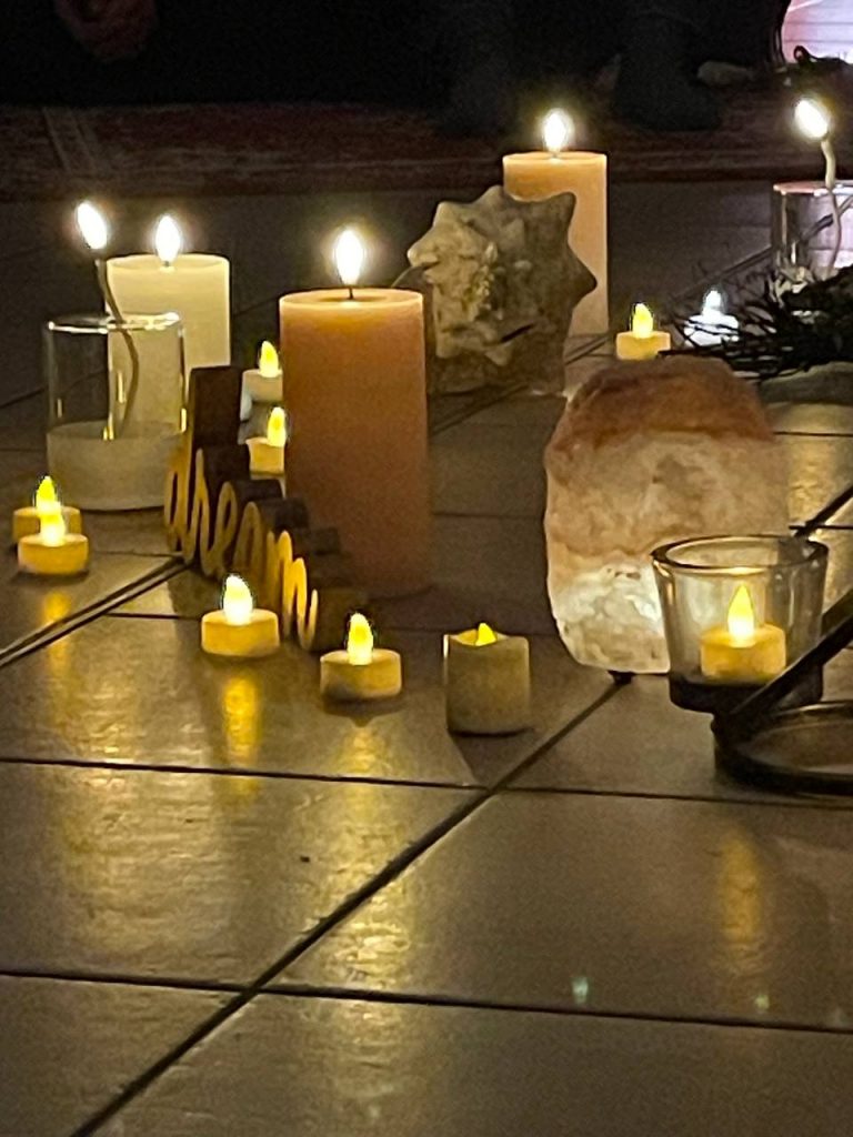Puis la veillée se poursuit à l’intérieur, dans la grande salle, avec une décoration féérique de bougies LED. Les tambours reprennent leur place, puis le didgeridoo, puis les voix… Les uns après les autres, les sons se déploient, créent une atmosphère à la fois douce et puissante.