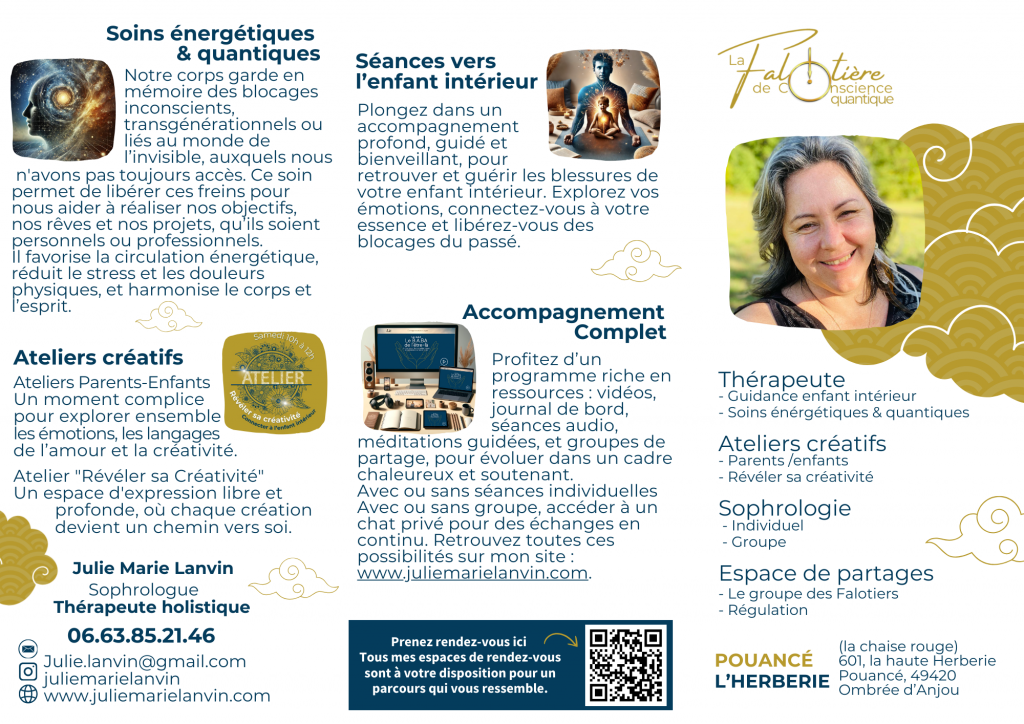 Les soins que j’utilise sont simples, efficaces et profonds. Je me situe à la lisière des domaines de la psychologie et de l’énergétique.